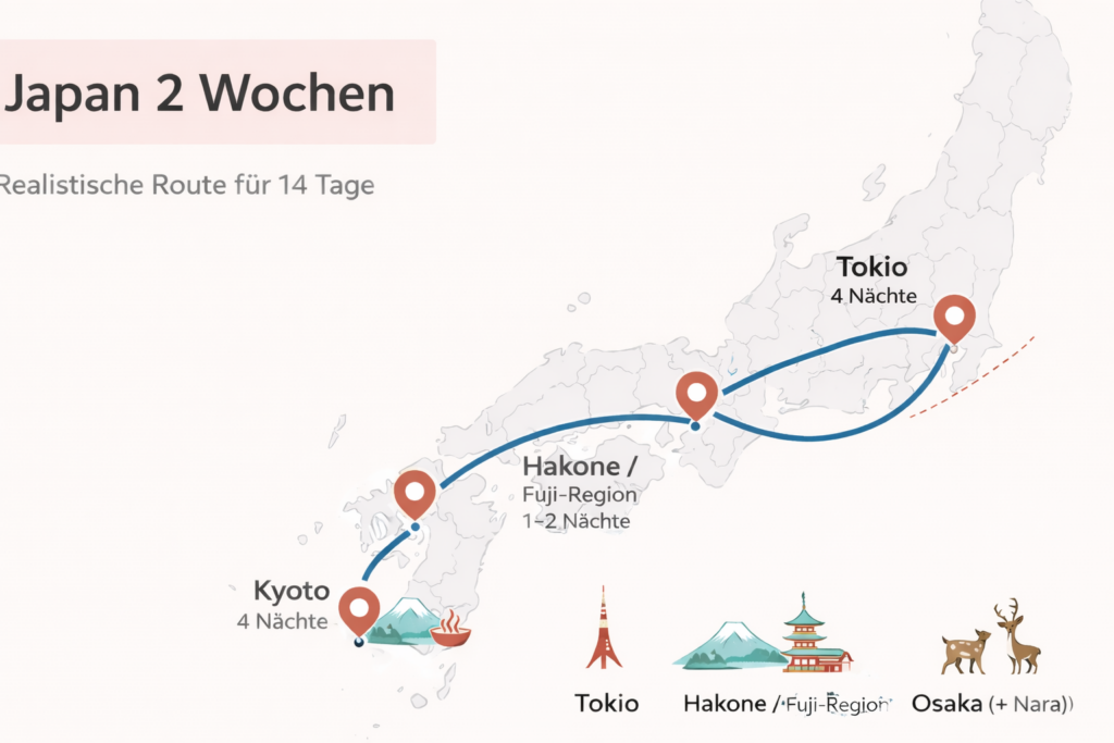 Diese 2-Wochen-Route durch Japan ist realistisch geplant: mit sinnvollen Reisezeiten, transparenten Kosten und klaren Verbindungen. Kein unnötiger Stress, kein Programm-Marathon – sondern eine entspannte Reise, die Japan verständlich und angenehm zeigt.